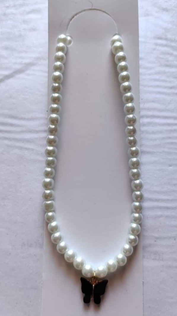 A matching white pearl beaded necklace with a coordinating black butterfly pendant