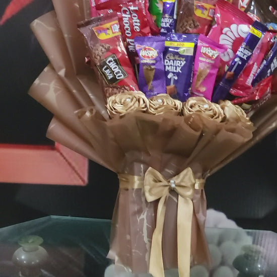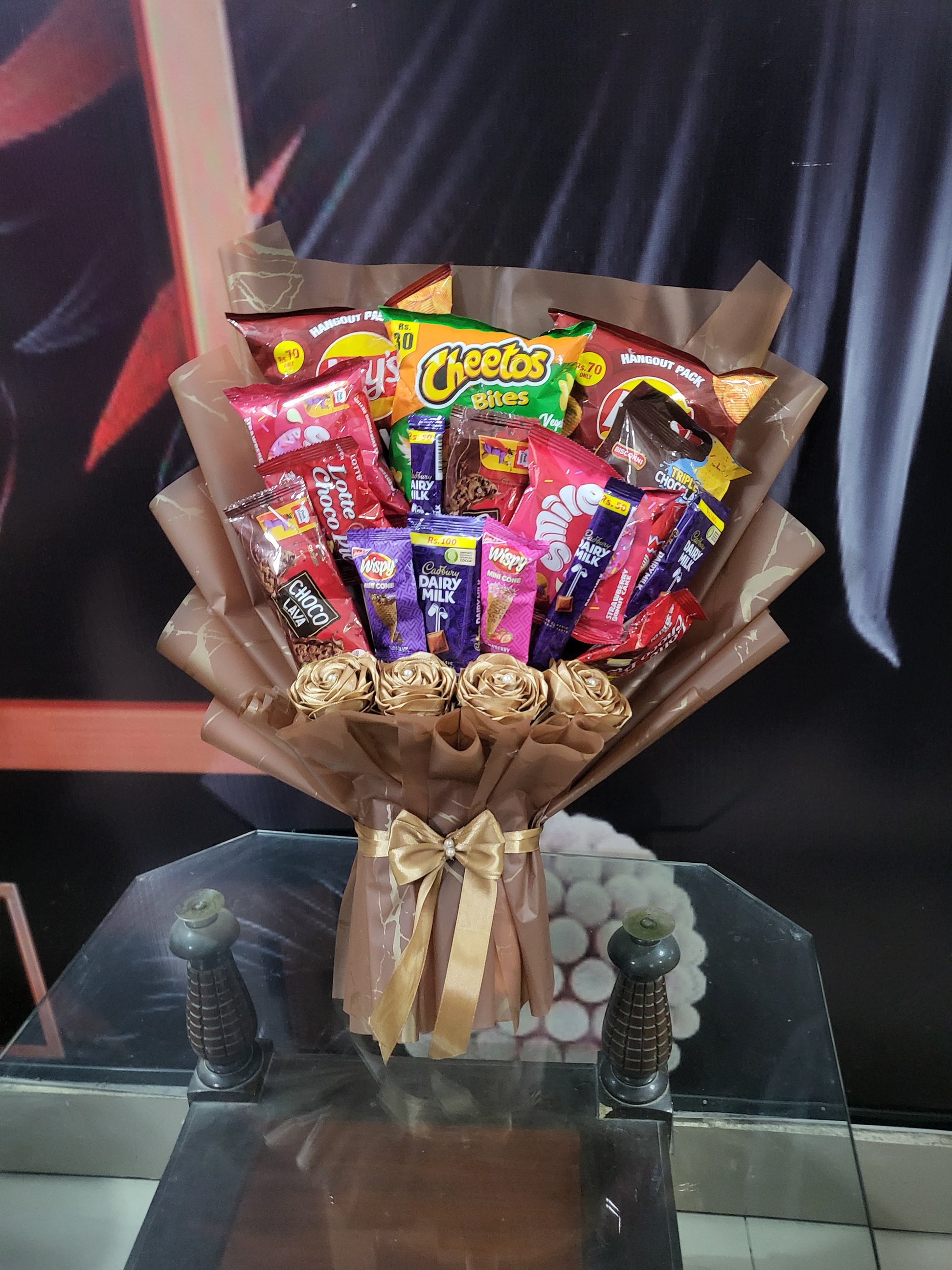 This bouquet is a delightful alternative to traditional flower arrangements, featuring a vibrant mix of premium chocolates and crunchy snacks—all wrapped elegantly in luxurious, gift-ready packaging.